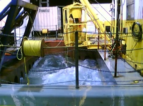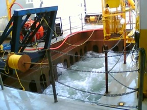 In this film, [and this one] you will see what's known as a "moon pool". AKA Hole in a boat. We are experiencing some "weather". The seas are only about 10-15' high, which is negligible in comparison to my Bering jaunt. We are not sending divers into the water in these conditions, but I am working over this heaving mass of saltwater. What we are doing until this "weather" passes is implementing a $10,000 tool called a "Mesotech". This Mesotech is mounted on a tripod, and has a rotating head that takes high resolution images of the sunken oil rigs that we drop it on.